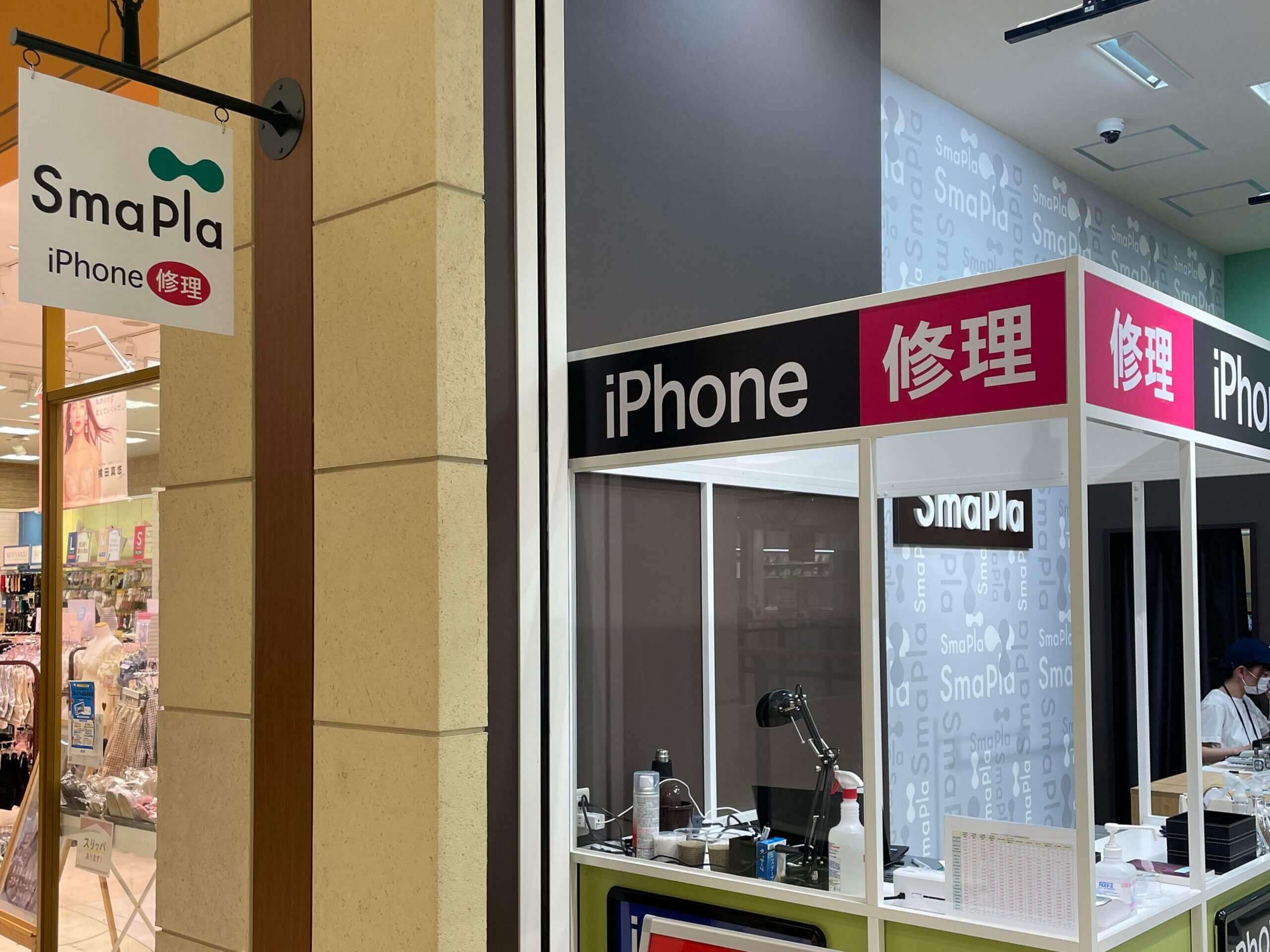 2階に上がると、左手に「Smapla」の標識プレートと、 iPhone修理のブースがございます。